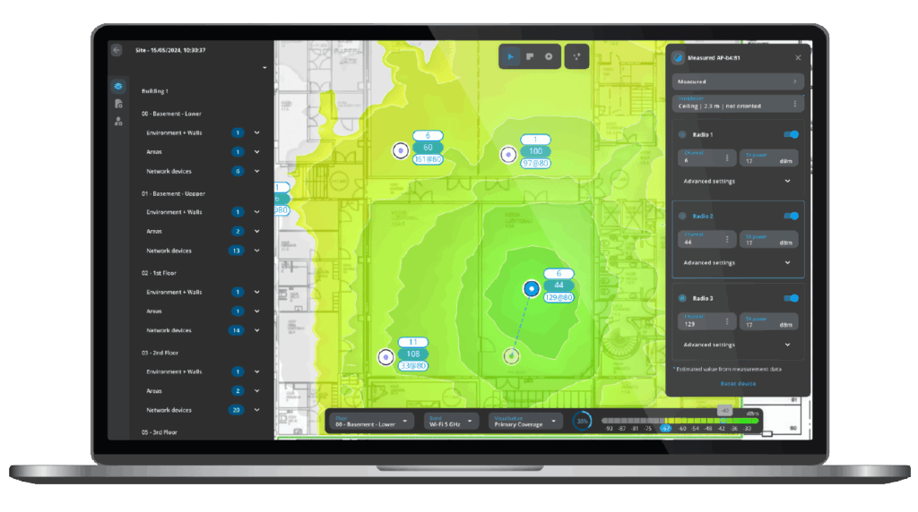 À partir des plans du bâtiment, nous réalisons une simulation de propagation des ondes pour déterminer le nombre et l’emplacement optimal des bornes d’accès. Cette approche permet de prévoir les performances du réseau, de limiter les zones blanches et d’optimiser le budget en évitant les équipements superflus.